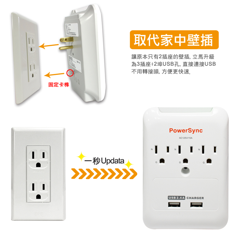 立家中2插座升3插座+2埠USB孔,可快速充,智能安全LED,用於各式智慧型手及3C品!