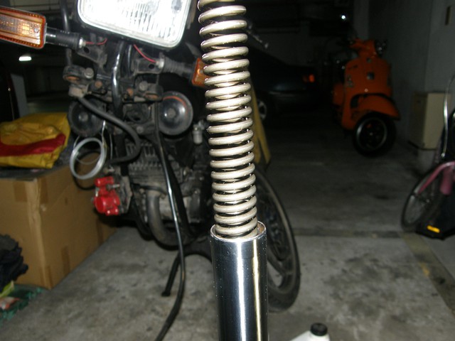 上星期已拆的前叉底螺 , 拆下放前叉油 .