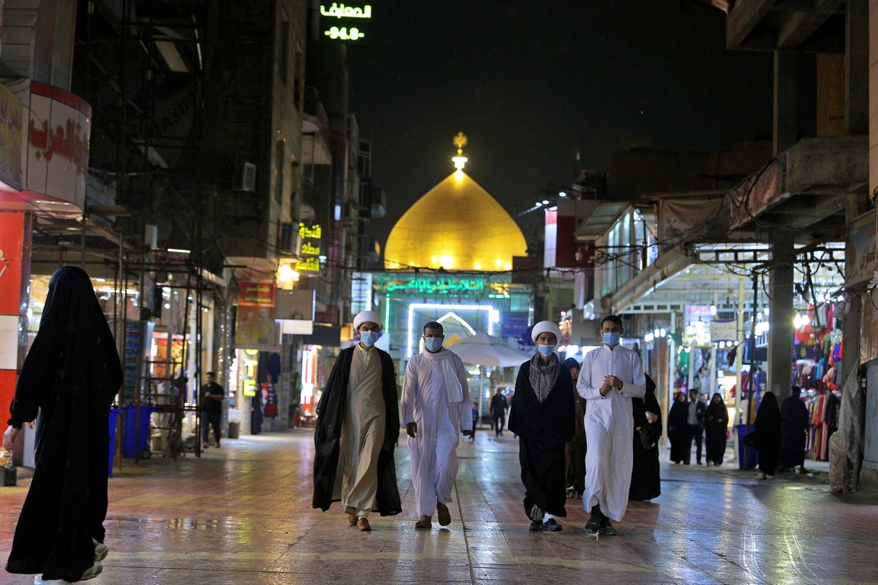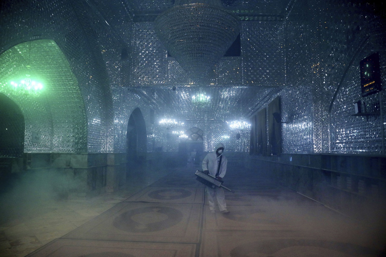 伊朗德黑一清真寺,有人在寺消毒。(AP)