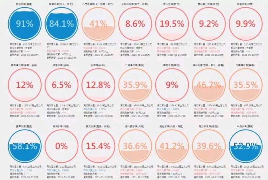 根台中薪借推台水及水情料,今(22日)二水蓄水量9.2%,苗栗明德水9.9%,南投社水9%,新竹苗栗永和山水8.6%,台中德基水6.5%,台南白河水依是0%。