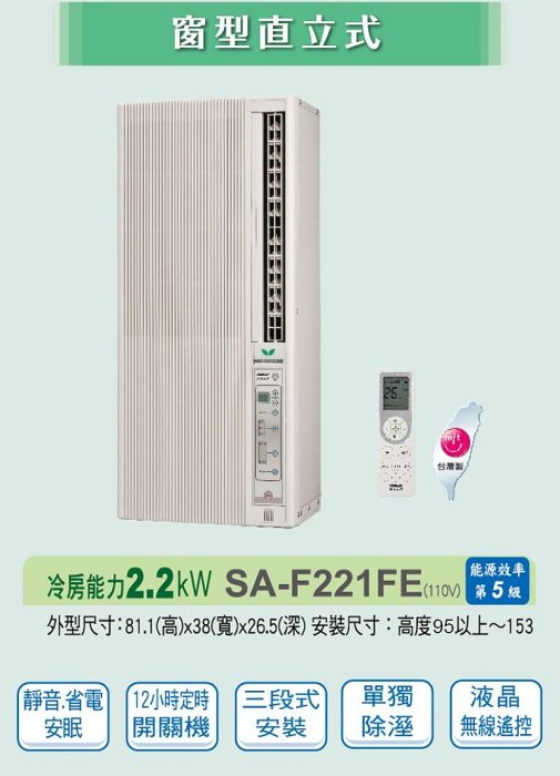 優寶購物《ubao.Tw》特貨品商城,黑貓宅配,取貨付款,SANLUX台灣三洋 3-4坪 直立式窗型冷氣 SA-F221FE (110V) 12小時定時開關機 | Yahoo拍賣