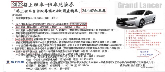 優寶購物《ubao.Tw》特貨品商城,黑貓宅配,取貨付款,持22年格上租車券"可能"租到GRAND LANCER 1.8取車平日刷380假日刷620 | Yahoo拍賣
