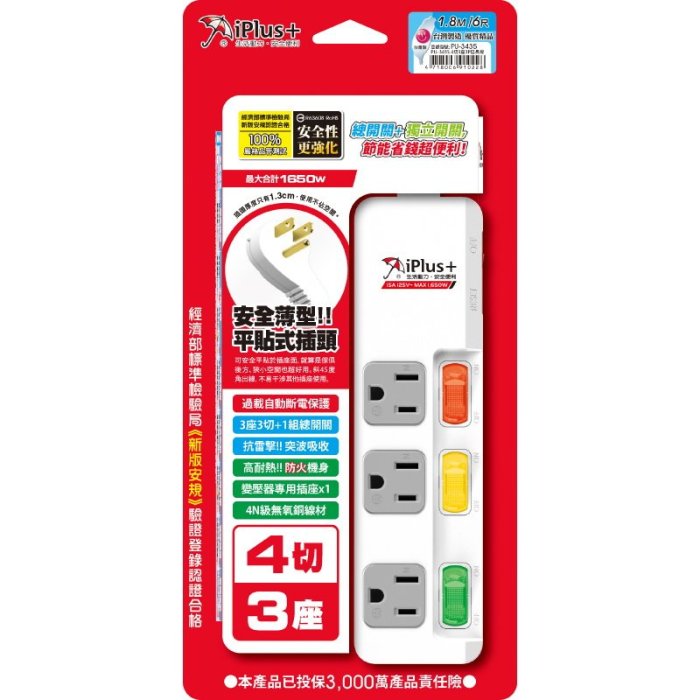 優寶購物《ubao.Tw》特貨品商城,黑貓宅配,取貨付款,含稅【晨風社】台灣製 保護傘 新安規 3座4切 3孔 3P 延長線 9尺 (2.7m) PU-3435 過載斷電 | Yahoo拍賣