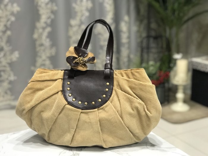 優寶購物《ubao.Tw》特貨品商城,黑貓宅配,取貨付款,【nuee 造型手提包】全新 駝色絨布條紋/半圓形布包/附裝飾花可以取下 | Yahoo拍賣