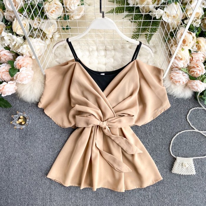 優寶購物《ubao.Tw》特貨品商城,黑貓宅配,取貨付款,☆女孩衣著☆歐美風設計感假兩件吊帶鏤空露肩時髦蝙蝠袖繫帶收腰荷葉擺上衣潮(NO.42) | Yahoo拍賣
