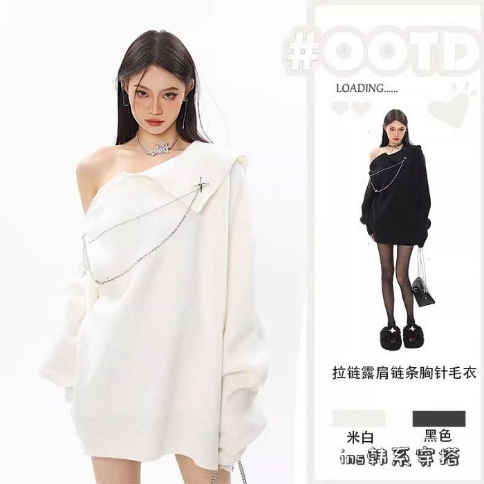 優寶購物《ubao.Tw》特貨品商城,黑貓宅配,取貨付款,純欲風甜美拉鏈露肩鏈條胸針甜辣打底衫 顯瘦氣質女生針織衫 溫柔風慵懶風中長款女生韓版毛衣 女士毛衣長袖休閒百搭毛衣 | Yahoo拍賣