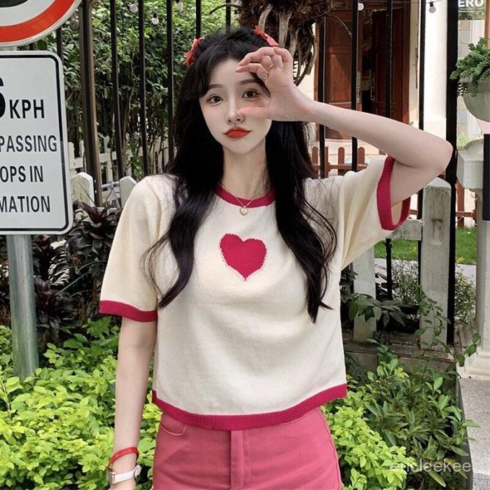 優寶購物《ubao.Tw》特貨品商城,黑貓宅配,取貨付款,1878#甜美愛心短袖針織衫T恤女夏季2025新款ins寬鬆拚色圓領上衣 | Yahoo拍賣