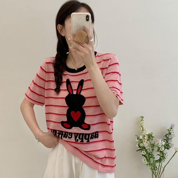 優寶購物《ubao.Tw》特貨品商城,黑貓宅配,取貨付款,【熱銷】洋氣輕薄兔子T恤女條紋短袖針織衫時尚夏季減齡韓系寬鬆大碼圓領 | Yahoo拍賣