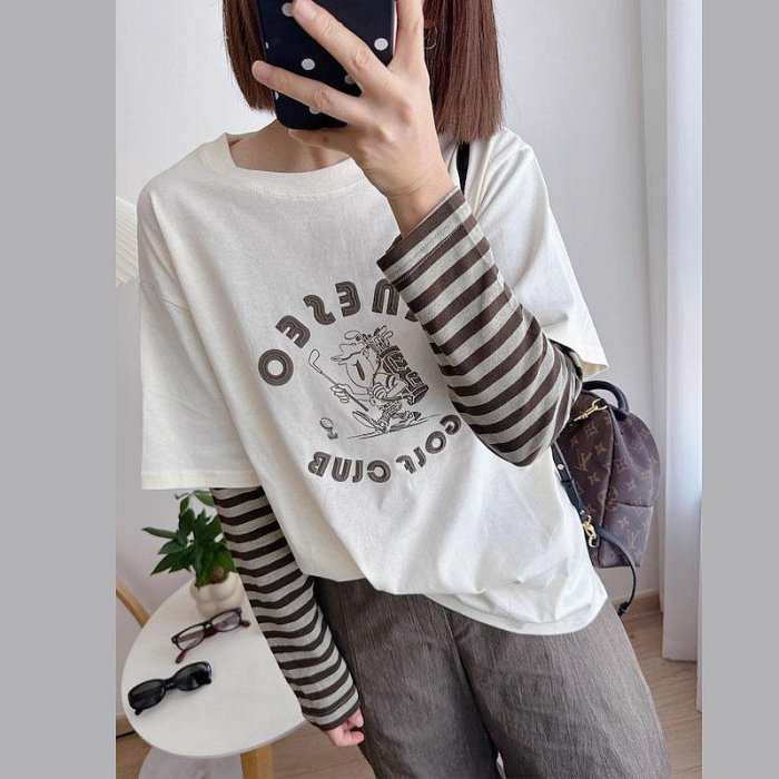 優寶購物《ubao.Tw》特貨品商城,黑貓宅配,取貨付款,【極簡時尚】純棉立體卡通印花寬鬆中長款條紋假二件長袖T恤 | Yahoo拍賣