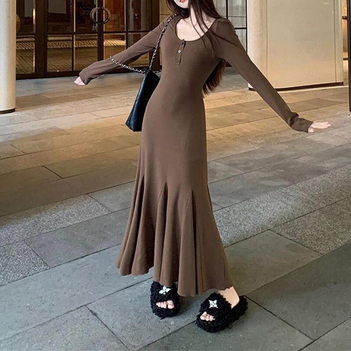 優寶購物《ubao.Tw》特貨品商城,黑貓宅配,取貨付款,連衣裙女裙子女服裝復古修身長袖純色打底連身裙子春秋季新款顯瘦氣質收腰魚尾裙子流行女裝休閒服飾~AC18634~愛購網~全館699免運 | Yahoo拍賣