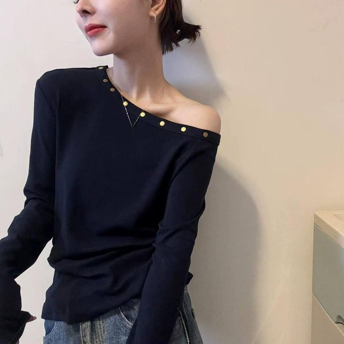 優寶購物《ubao.Tw》特貨品商城,黑貓宅配,取貨付款,2025早秋斜肩時髦長袖上衣4色復古圓形金銅色鈕扣裝飾 | Yahoo拍賣