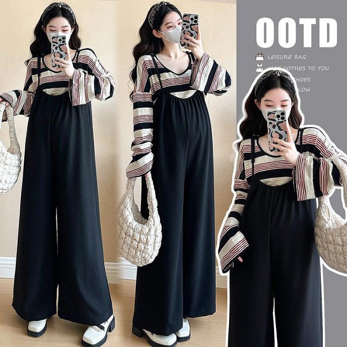 優寶購物《ubao.Tw》特貨品商城,黑貓宅配,取貨付款,實拍 現貨 早春新款條紋恤+顯瘦背帶褲兩件套孕婦裝 | Yahoo拍賣