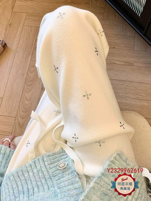優寶購物《ubao.Tw》特貨品商城,黑貓宅配,取貨付款,明星衣櫃=白色重工燙鉆針織褲子女冬季新款高腰加厚保暖寬松垂感直筒闊腿褲 | Yahoo拍賣