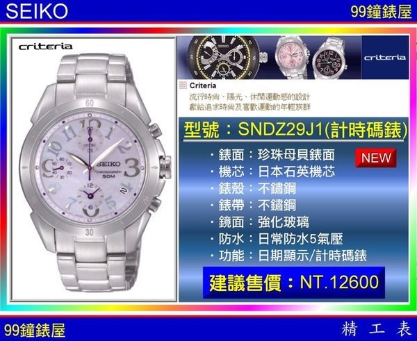 優寶購物《ubao.Tw》特貨品商城,黑貓宅配,取貨付款,【美中鐘錶*99鐘錶屋】SEIKO精工錶:〈Criteria系列〉(SNDZ29J1)計時碼錶/紫貝~最後乙只SK004 | Yahoo拍賣